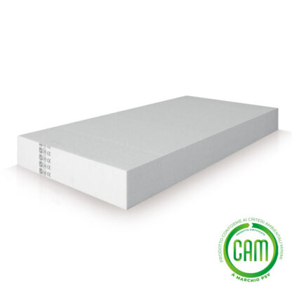 Pannelli termoisolanti in EPS (polistirene espanso sinterizzato) a celle chiuse, di colore bianco, con euroclasse E di reazione al fuoco, conformi alle norme UNI EN 13163, UNI EN 13499 (ETICS), a marchio CE. Tale lastra ha caratteristiche di stabilità dimensionale, planarità e tolleranza dimensionale migliorate, grazie al processo di detensionatura ottenuto per cicli di pressatura ai quali sono sottoposti i blocchi di EPS prima della fase di taglio in lastre. Gli isolanti della linea ECO sono conformi ai C.A.M. di cui al D.M. 11 ottobre 2017 ed a marchio PSV MIX-ECO, in quanto realizzati mediante l’impiego di materiali da riciclo dimostrato con Cert. n. 1951/2020 secondo i requisiti specificati nel Reg. “Plastica Seconda Vita” Ed. 1 rev. 3/2018.